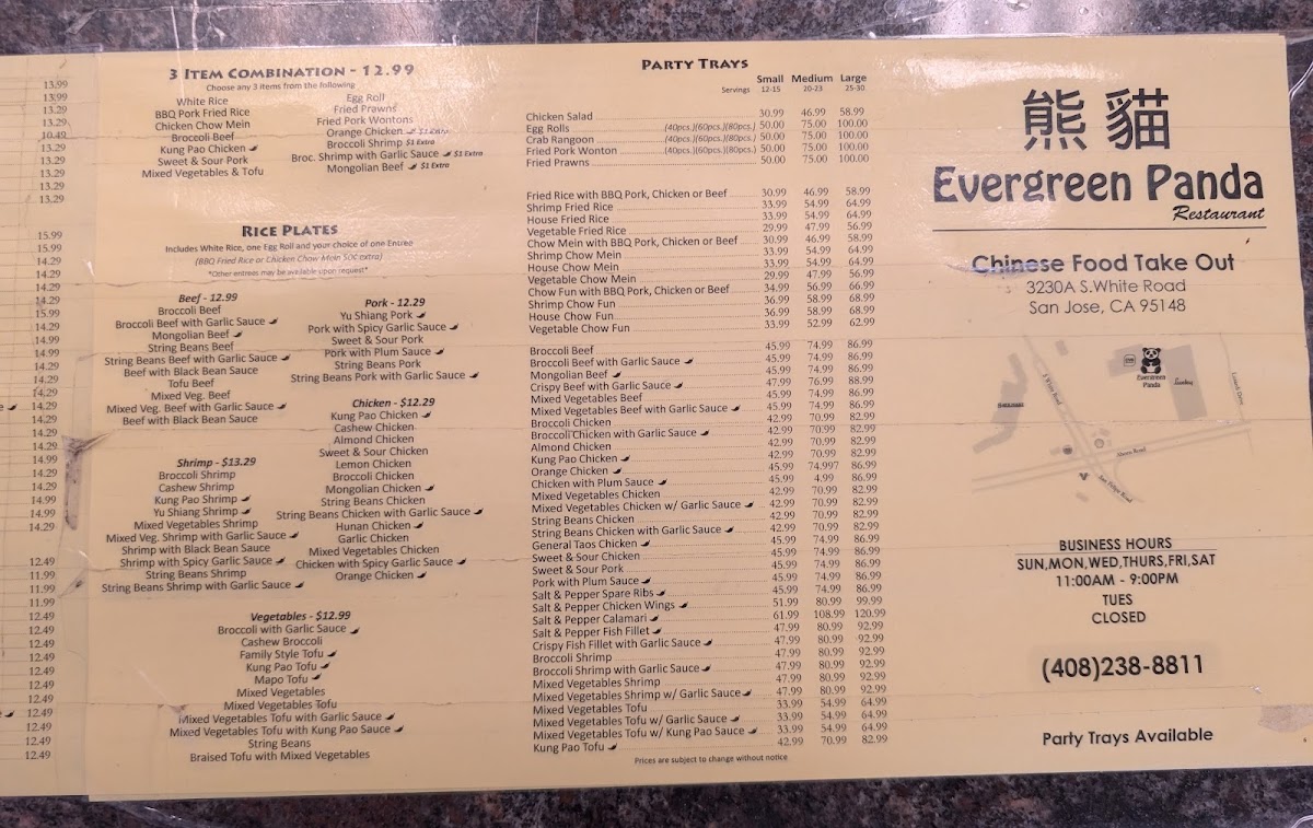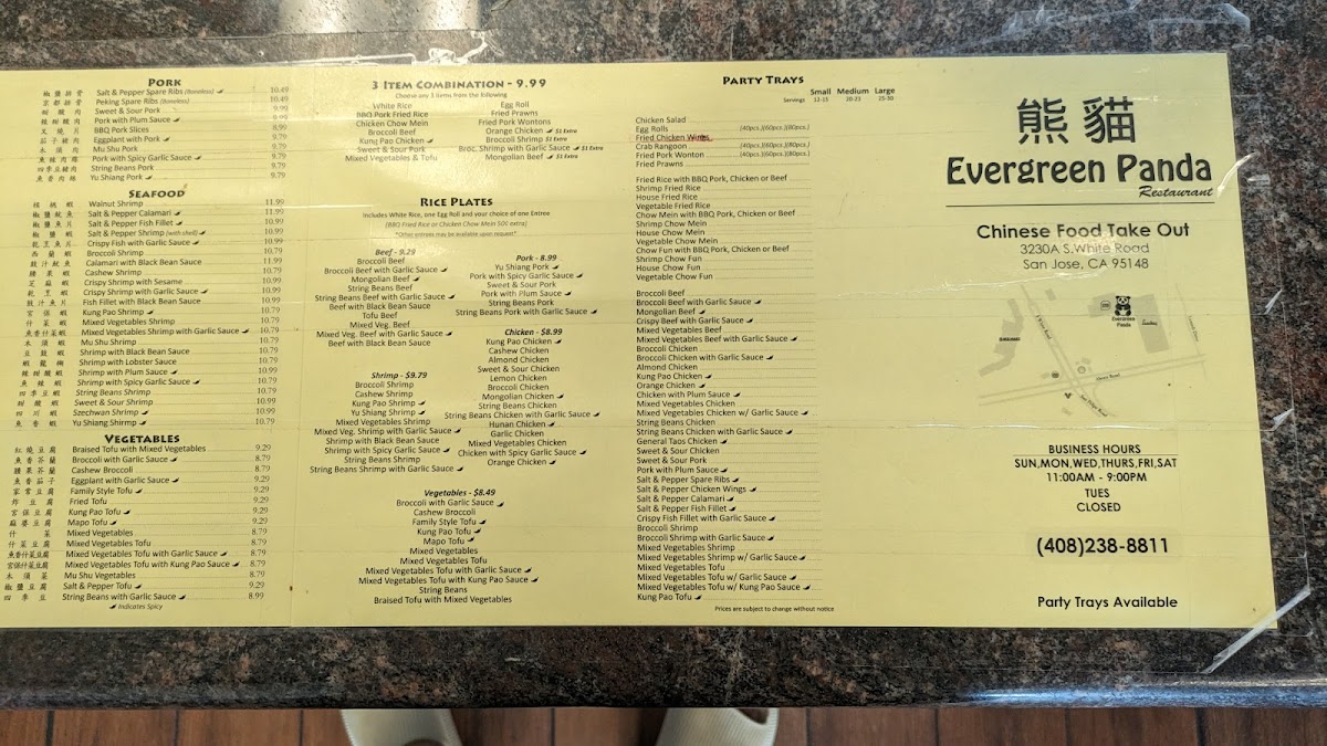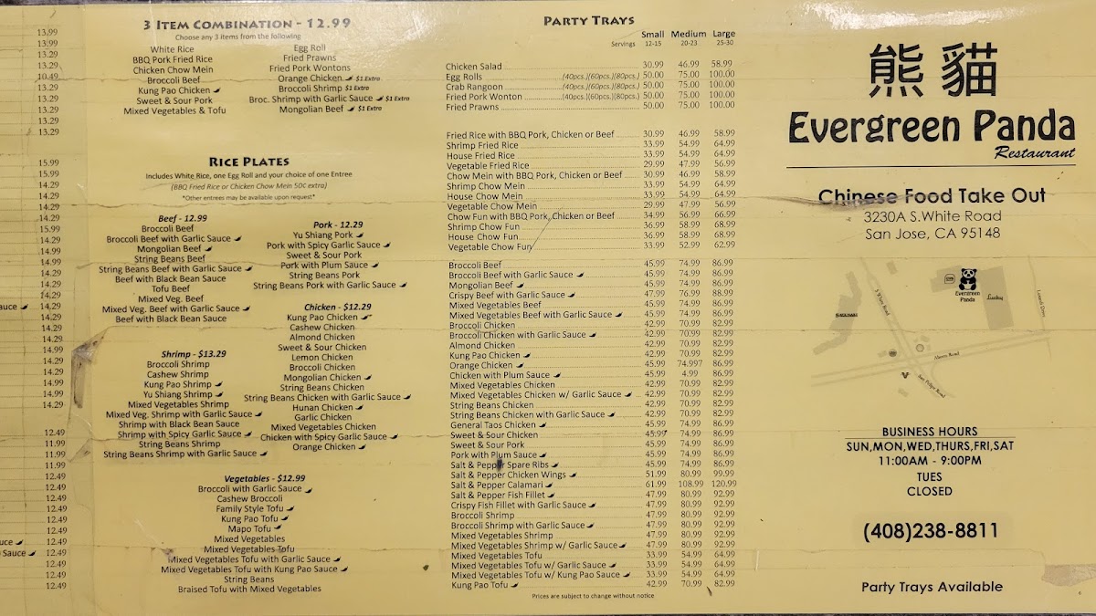 Evergreen Panda Restaurant offers a straightforward, casual menu that centers around classic Chinese dishes crafted with fresh ingredients and made to order. The menu features a comforting mix of rice plates, noodle dishes, and savory entrees that fit well into a quick lunch or relaxed dinner at home.